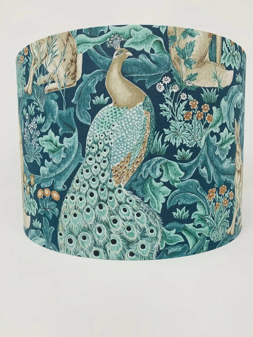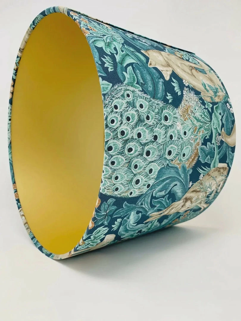 Round drum-shaped lampshade, covered by hand in William Morris’ Forest fabric with a deep plum coloured background. Pale Gold interior.