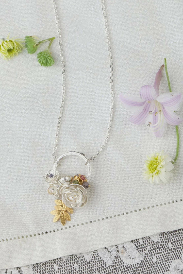 A beautiful cluster of intricately detailed flowers including our dahlia flower with iolite and a forget me not cluster of mixed tourmaline centres,all nestle alongside peony flowers with white pearl centre stones.