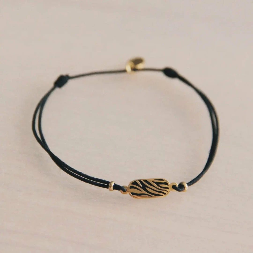 The elastic bracelet in the color black has a tag with zebra print. The bracelet is adjustable by means of a sliding knot. Material: Stainless Steel (= no discolouration)