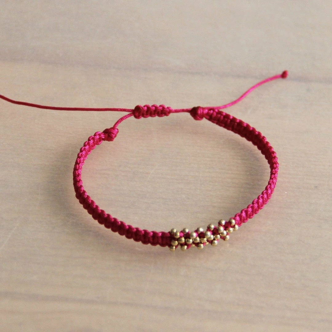 This macrame bracelet in the color fuchsia has gold-coloured accents and a sliding knot.