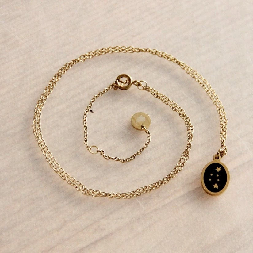 This fine short necklace has an oval charm with star rain filled with black epoxy. The size of the necklace is 39.5 cm including clasp (+ adjustable size at 42.5 cm and 45 cm).