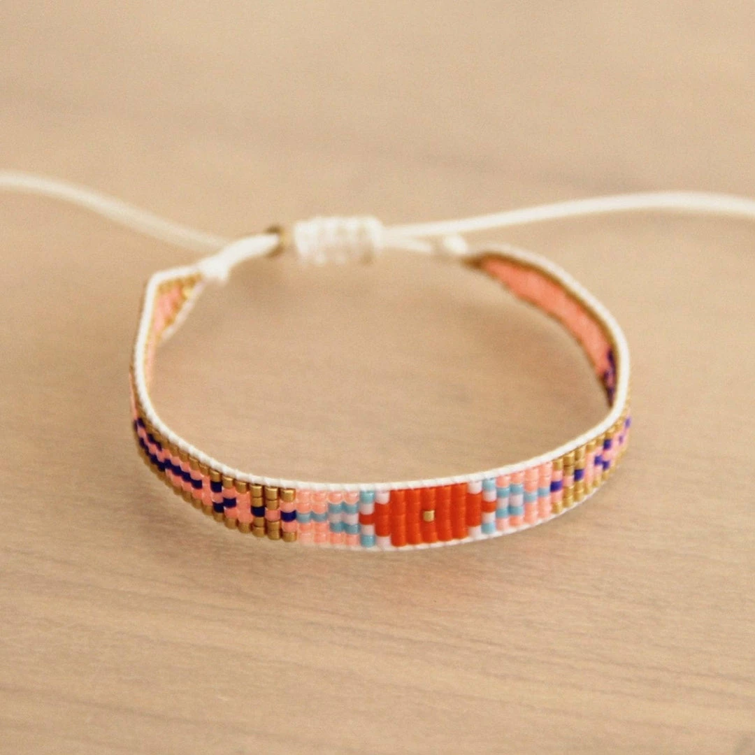 This beaded weaving bracelet in the colors coral, dark blue, red and gold has a sliding knot and is therefore adjustable. Material: Miyuki