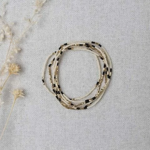 These handcrafted bracelets are 6 individual elasticated strands, white, gold and black tiny beads, wear them altogether or just a few at a time. A great piece for the jewellery box.
