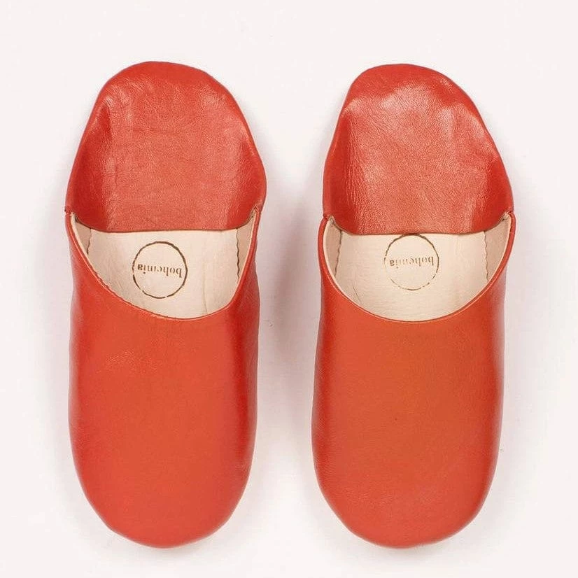 Women’s Moroccan Leather Babouche Basic Slippers in Burnt Orange, are a classic pair of bespoke slippers in soft vintage pink coloured leather.Β Handmade using traditional techniques, these babouche slippers are crafted by a team of artisans in a workshop near Marrakech.