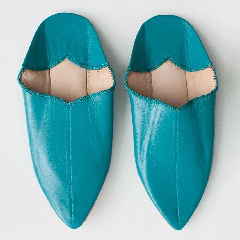 Women’s Moroccan Leather Babouche Pointed toe Slippers in Teal, are a classic pair of bespoke slippers in soft vintage pink coloured leather. Handmade using traditional techniques, these babouche slippers are crafted by a team of artisans in a workshop near Marrakech.