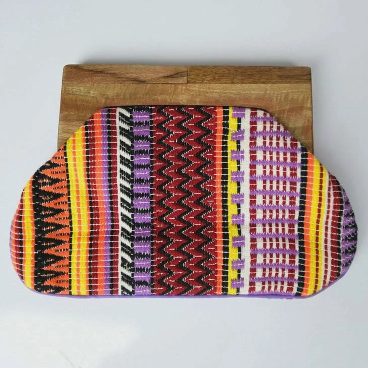 Gorgeous and unique clutch bag with a wooden handle and bright beaded fabric. Makes a real statement and is truly eyecatching!