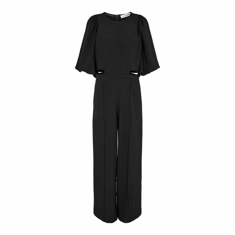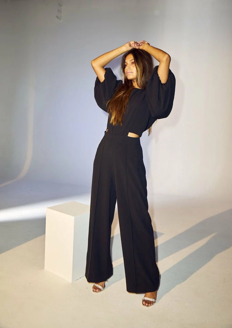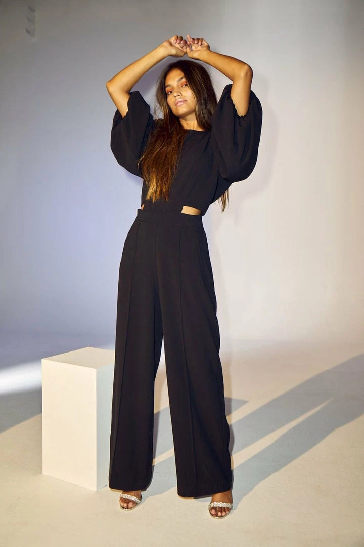 This is a real long term wardrobe staple. Made from a heavy, quality fabric, this jumpsuit oozes elegance with its wide leg trousers, puff sleeves and cut outs at the waist. A truly elegant piece.