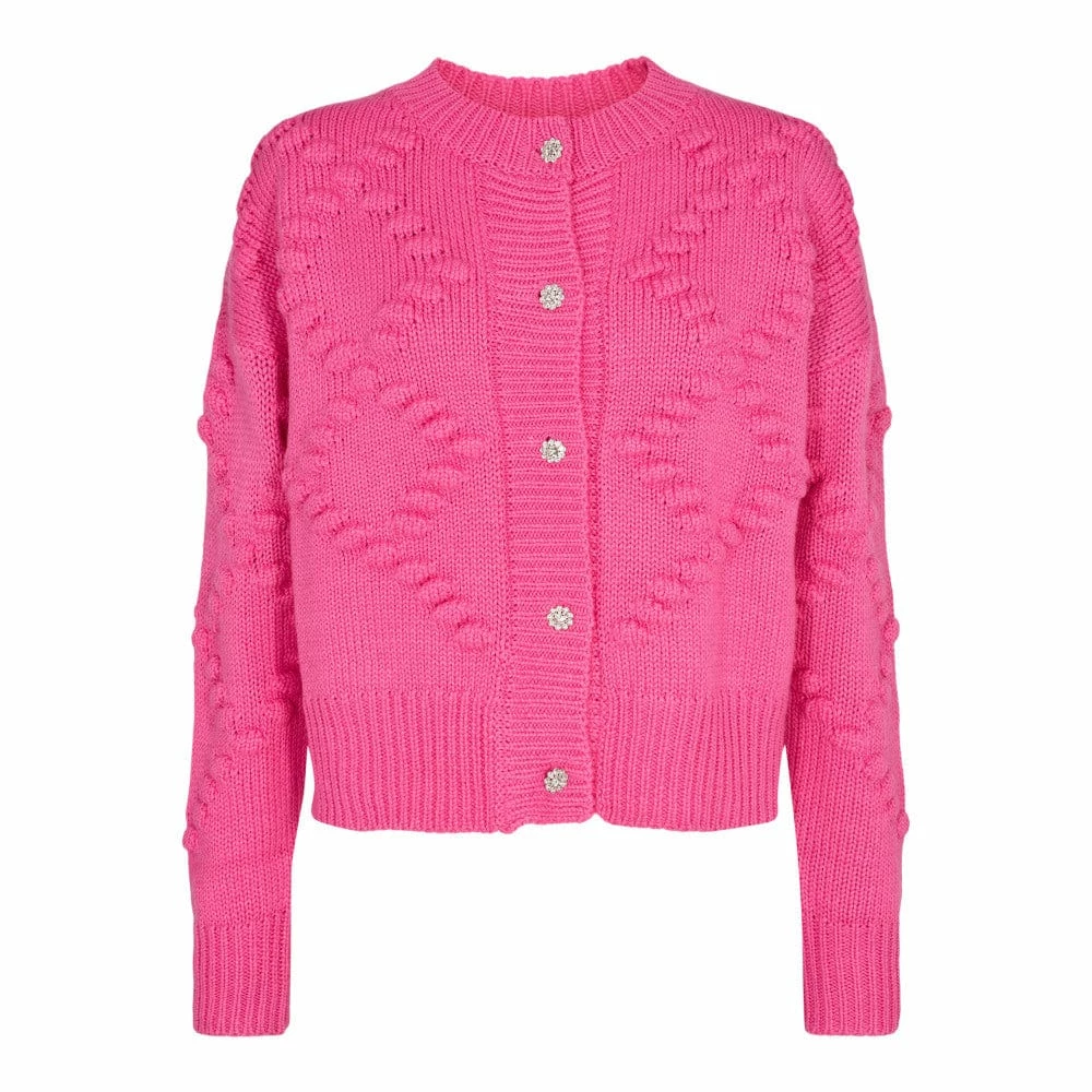 This lush cardigan in bright pink has beautiful diamante buttons and a bubble knit design. Team with with jeans for a chic Sunday lunch out vibe.