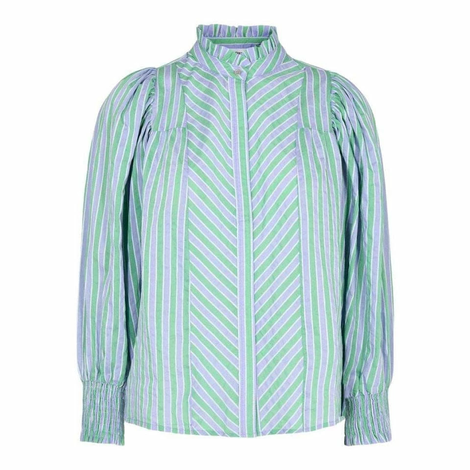 Cocouture Odine Striped Shirt in Vibrant Green. Crisp cotton. With a high neckline, this shirt features button fastening at back of neck and long sleeves. Wear tucked into denim or tailoring for a relaxed, feminine look.