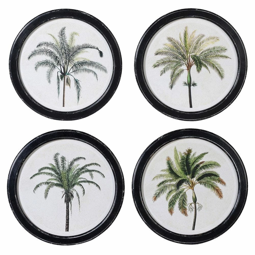 This is an excellent set of 4 palm pictures in round frames- the perfect collection to put on your wall over a console, bed or sofa.
