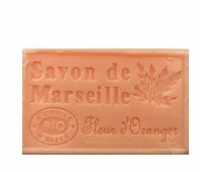 Marseille soap 125 gr. with vegetable oils and organic olive oil. 72% oil. Fragrance: Orange Blossom Made in France by hand.