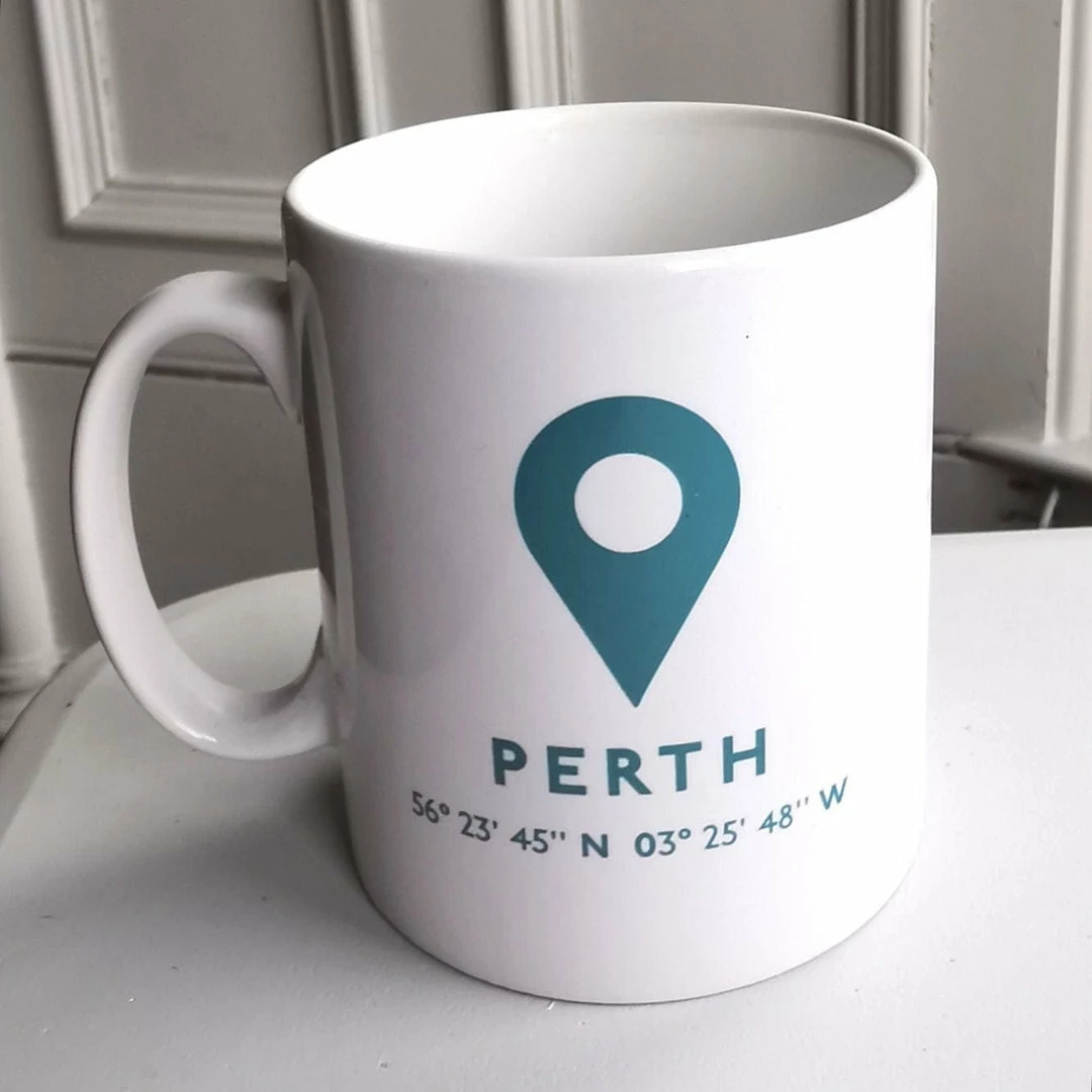 We are proud of offer a range of specially commissioned mugs to celebrate our Fair City! That’s right, the original Perth, the one that all the others are named after! This mug has a marker and coordinates simple design showing exactly where Perth in placed in the world! Enjoy your daily cuppa whilst celebrating our beautiful city.