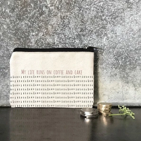 Sweet little purse that says “My life runns on coffee and cake” from East of India