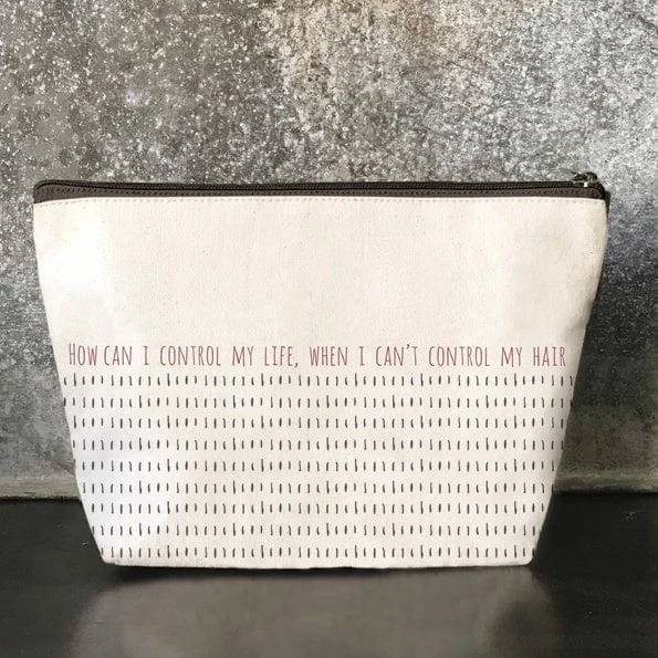 Cosmetic bag that says “How can I dontrol my life when I can’t control my hair!