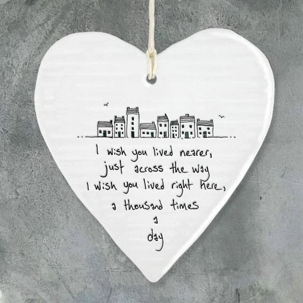“I wish you lived nearer, just across the way,I wish that you lived here a thousand times a day” wobbly porcelain heart. A lovely way to send a message to that special someone.