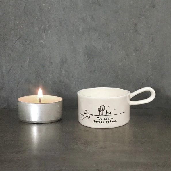 You are a lovely friend, porcelain tea light holder. Comes boxed.