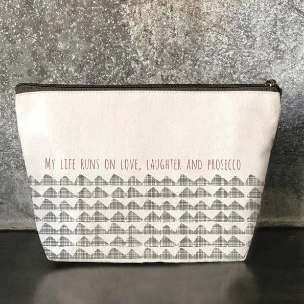 Cosmetic bag that says “My life runs on love, laughter & prosecco”