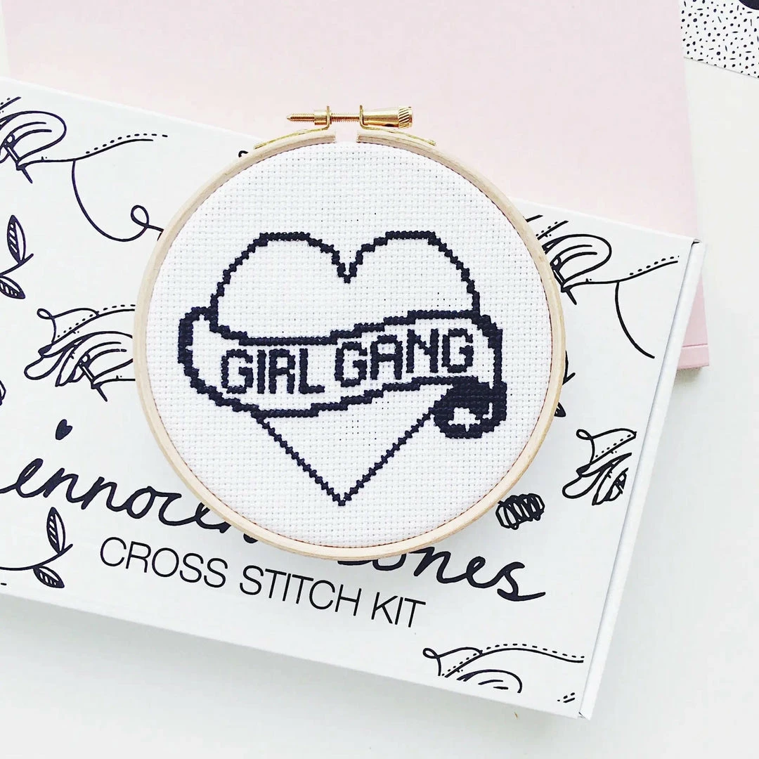 This kit is a great option for anyone wanting to learn cross stitch. This counted cross stitch kit includes: โข Printed design chart and guide to cross stitching โข Stranded cotton embroidery floss โข 5 inch wooden embroidery hoop โข Antique white 14 count Aida fabric โข Round point tapestry needle Each kit comes packaged in a 100% recyclable branded pouch.