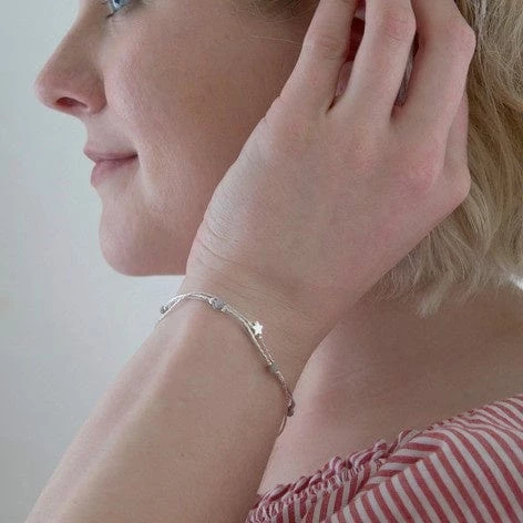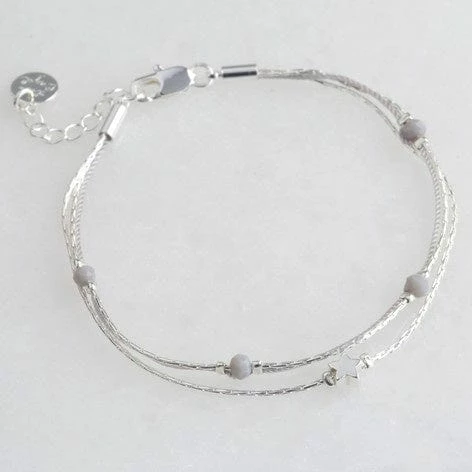 A friendship design beaded bracelet to share with your best friends, or keep as a precious piece for yourself. Featuring double strands of silver metal and thin grey cord, both strands are finished with complementing beads and a sweet star charm. With an extender chain and lobster clasp to secure. A wonderful gift for a teen who is experimenting with her jewellery collection.
