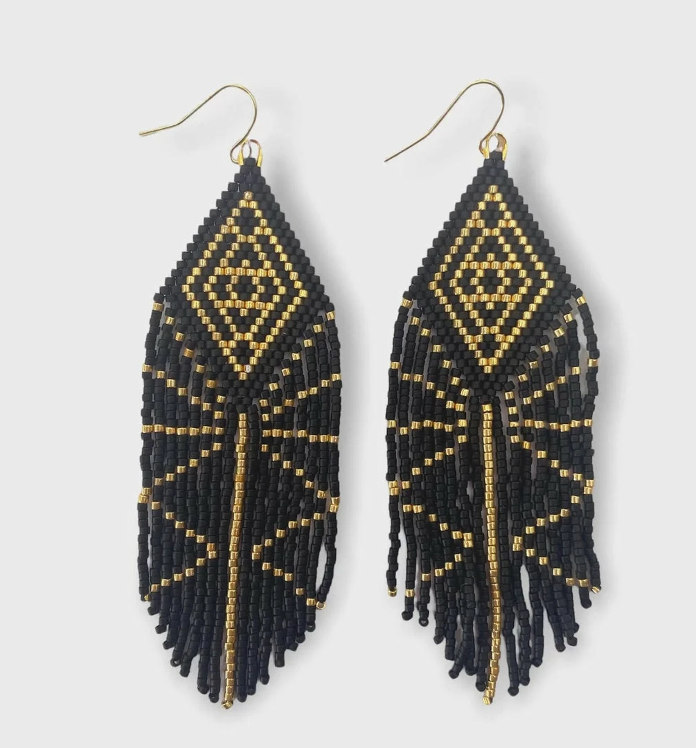 These stunning earrings are made from handwoven Japanese glass Miyuki beads. The black and gold contrast makes for an eye catching and elegant combination and the tribal inspired design adds an exotic element. The diamond is carefully woven together and the fringe is comprised of hand strung beads. These earrings are handwoven by women artisans in Medellin, Colombia who receive fair working conditions and compensation for their skills.