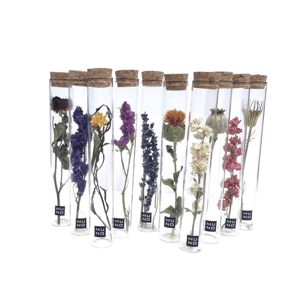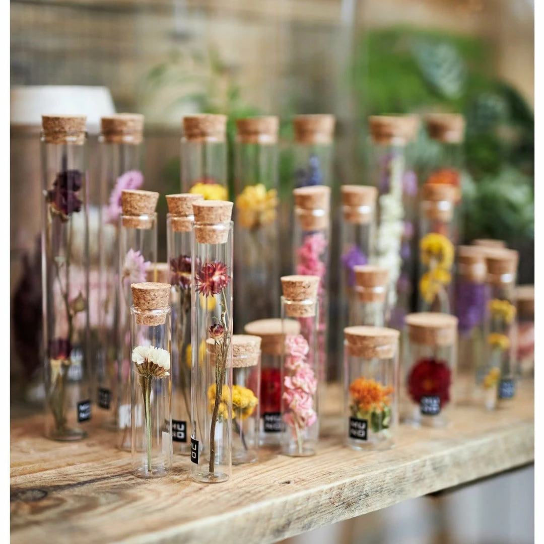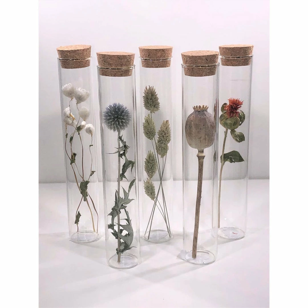 Glass tube including a dried flower.