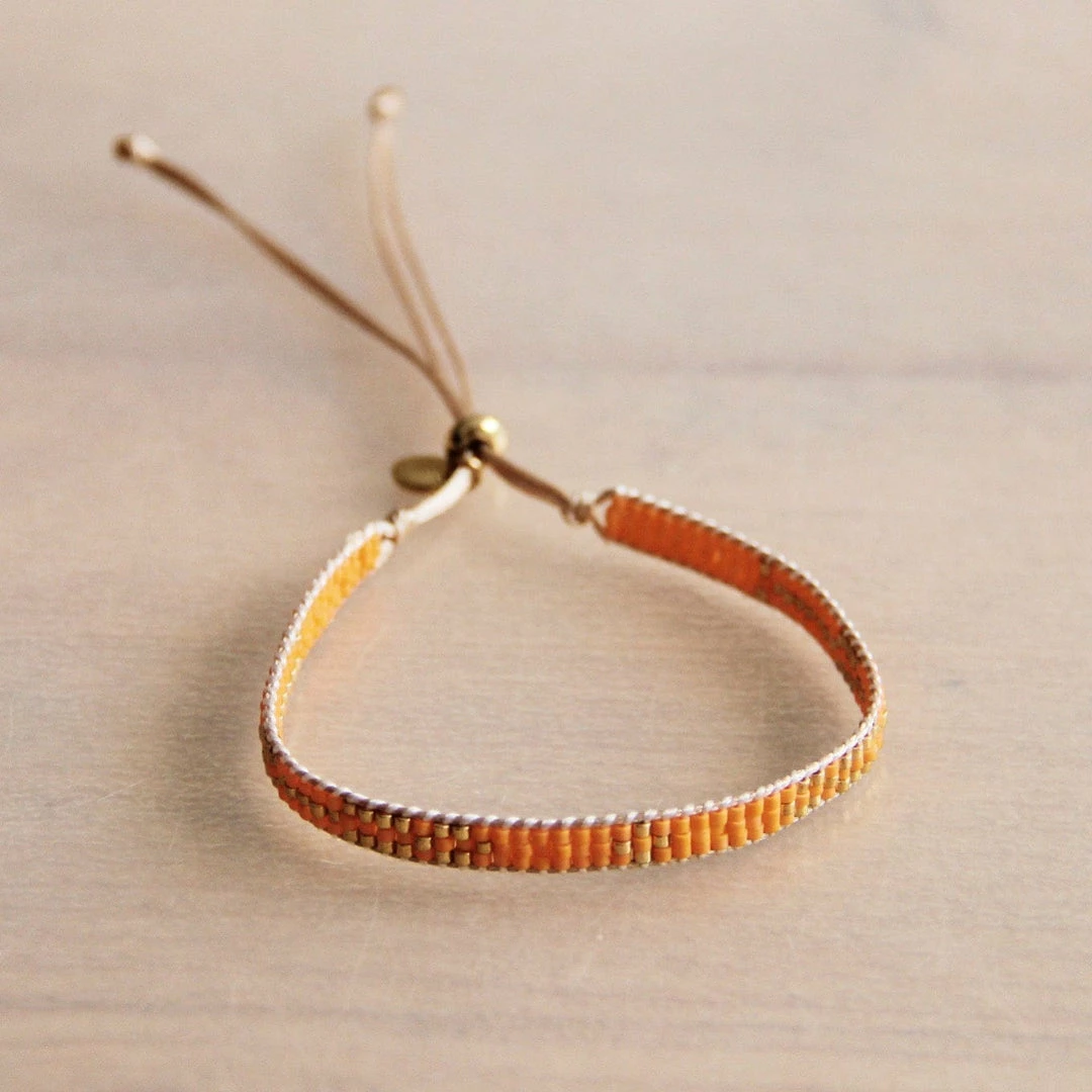 The weaving bracelet in the color orange has gold-coloured details and a sliding knot so that the bracelet is adjustable.