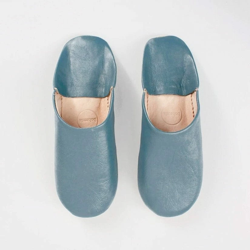 Women’s Moroccan Leather Babouche Basic Slippers in Blue Grey, are a classic pair of bespoke slippers in soft blue grey coloured leather.Β Handmade using traditional techniques, these babouche slippers are crafted by a team of artisans in a workshop near Marrakech.