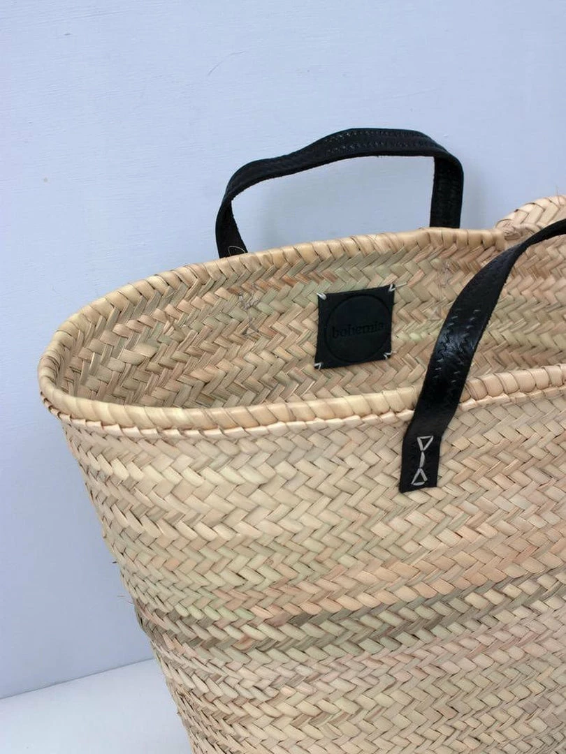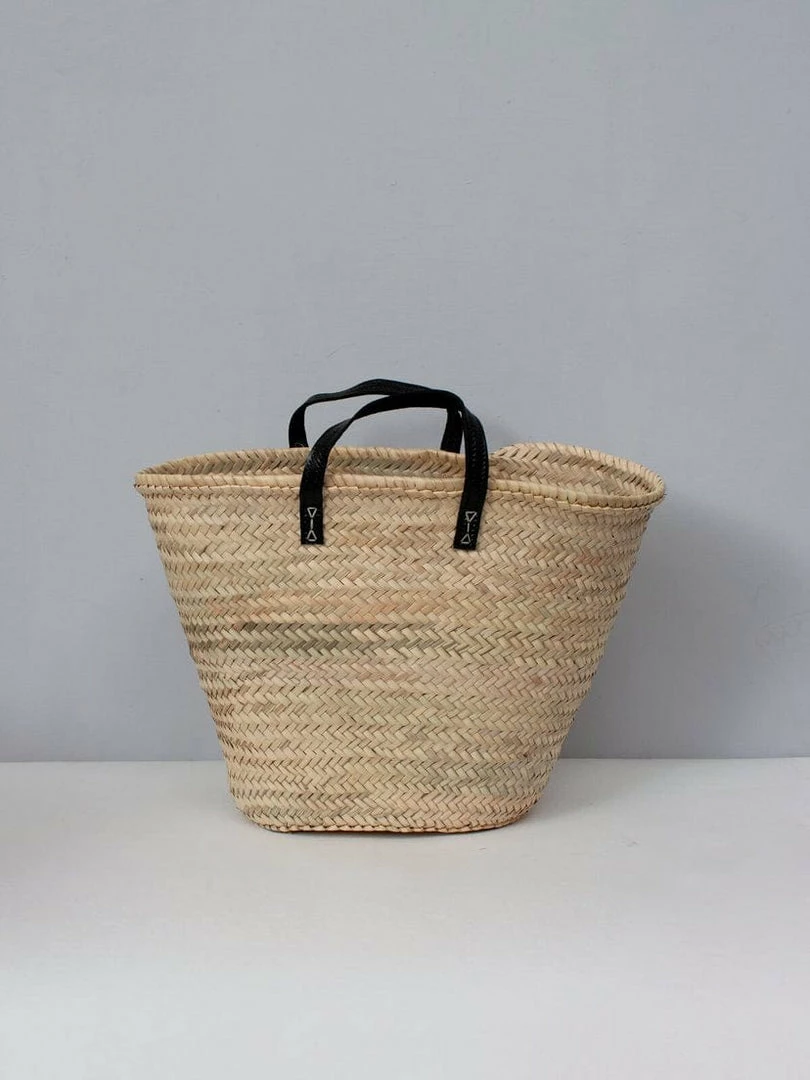 Our Parisienne Basket in Black is a classic market basket, handwoven by artisans in Morocco using locally sourced palm leaf and dyed natural leather. This generous shopping basket is ideal for farmers markets, the beach, or as a stylish home storage basket.