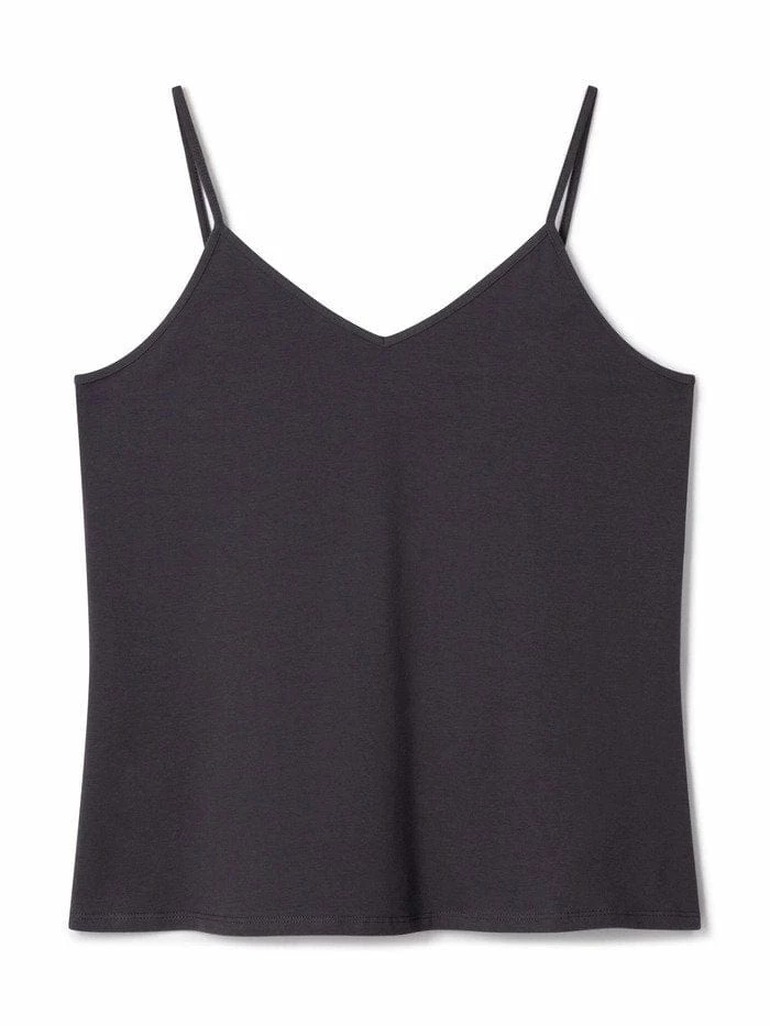 Organic jersey spaghetti strap vest available in 2 sizes. Essential vest top for everyone’s collection, can be worn under sweatshirts, knitwear or as loungewear. Shaped at the waist with pretty V neckline.