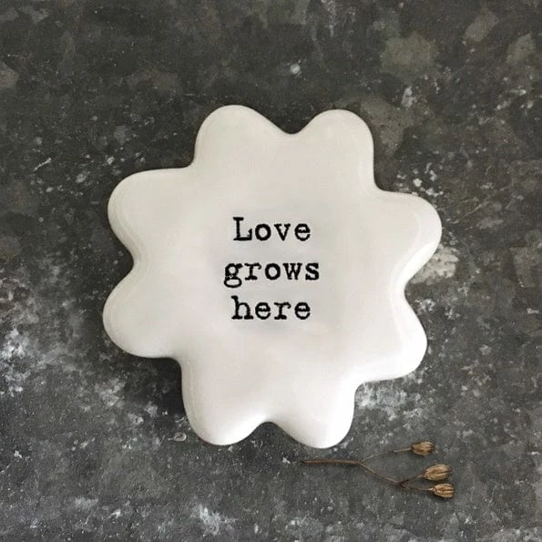 A new design from East of India, this little flower shaped stone bears the message “love grows here”. A lovely way to send a message to that special someone.