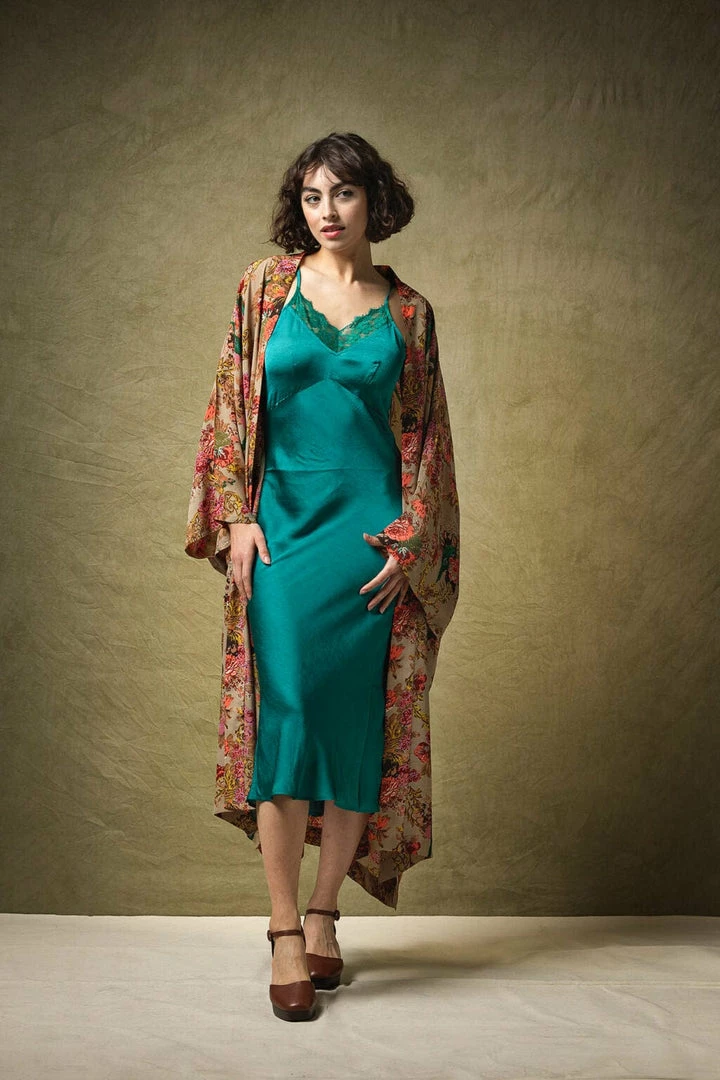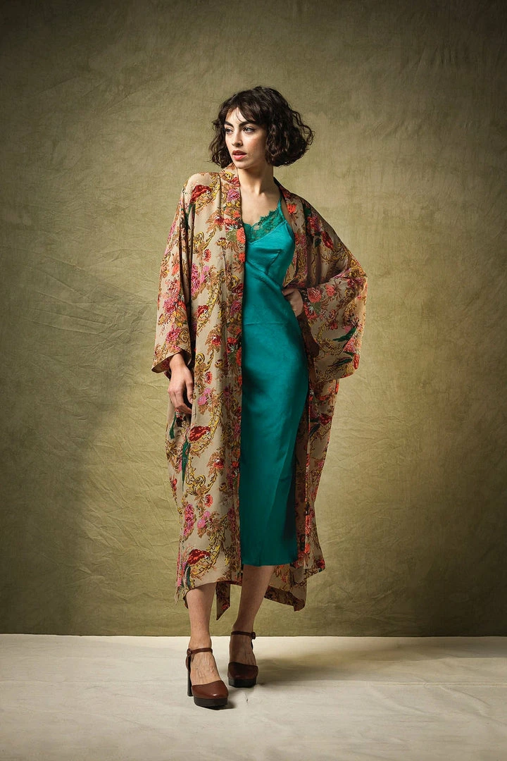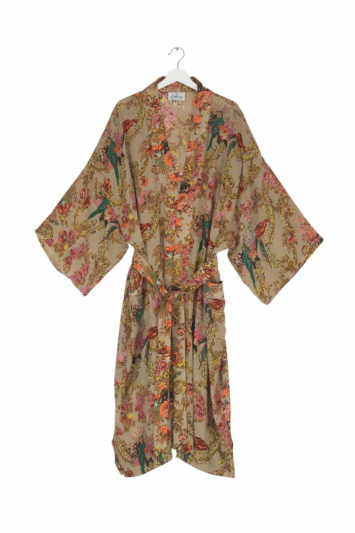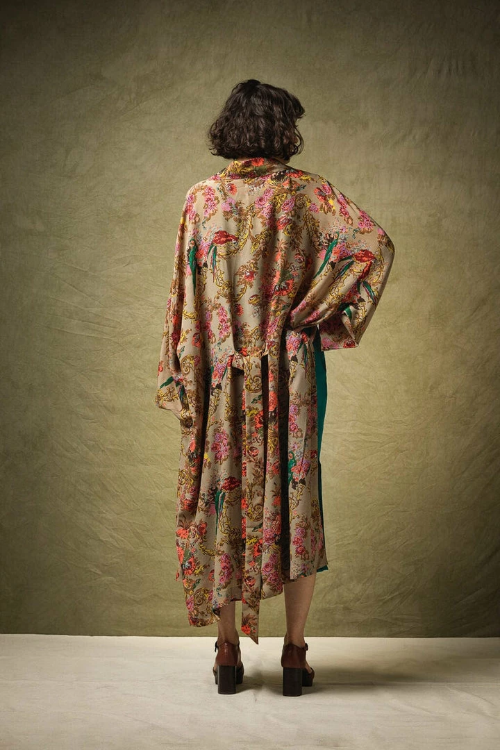This full-length kimono has traditional loose sleeves, a belt which is secured at the back (no belt loops) and a second interior tie for extra security. This kimono can be worn two ways, when tied at the back it makes a chic open fronted jacket. Alternatively, it can be worn tied at the front as a closed jacket or dress and secured using the interior waist tie.