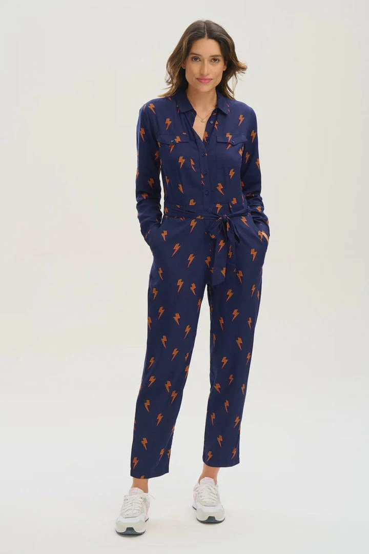 Cool but casual – this is the perfect everyday jumpsuit. Cut with a classic boilersuit shape the Charlie features a full sleeve shirt upper, side pockets and tapered legs. The relaxed shape gives a comfortable fit while the shirred waist creates a flattering silhouette. The Charlie features the tan and red lightning polka print on a navy base.