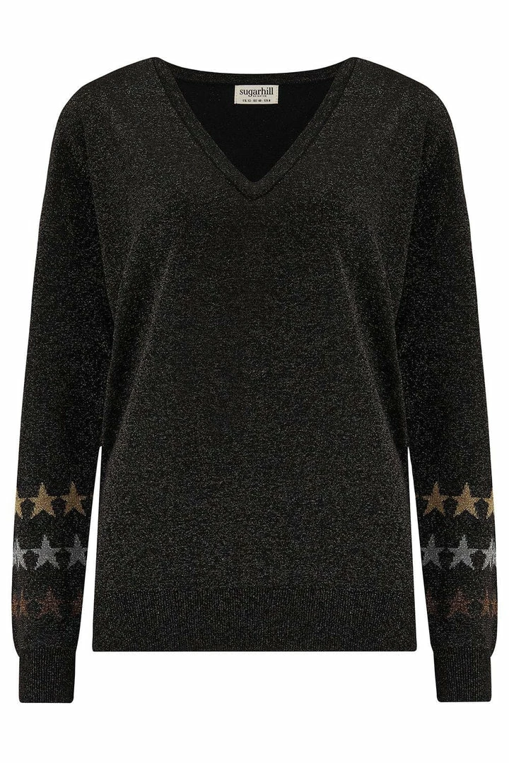 We adore this sparkly little number! So effortless, shimmery with a flattering v neck and stars on the sleeves for interest. A tiny bit of understated glam!