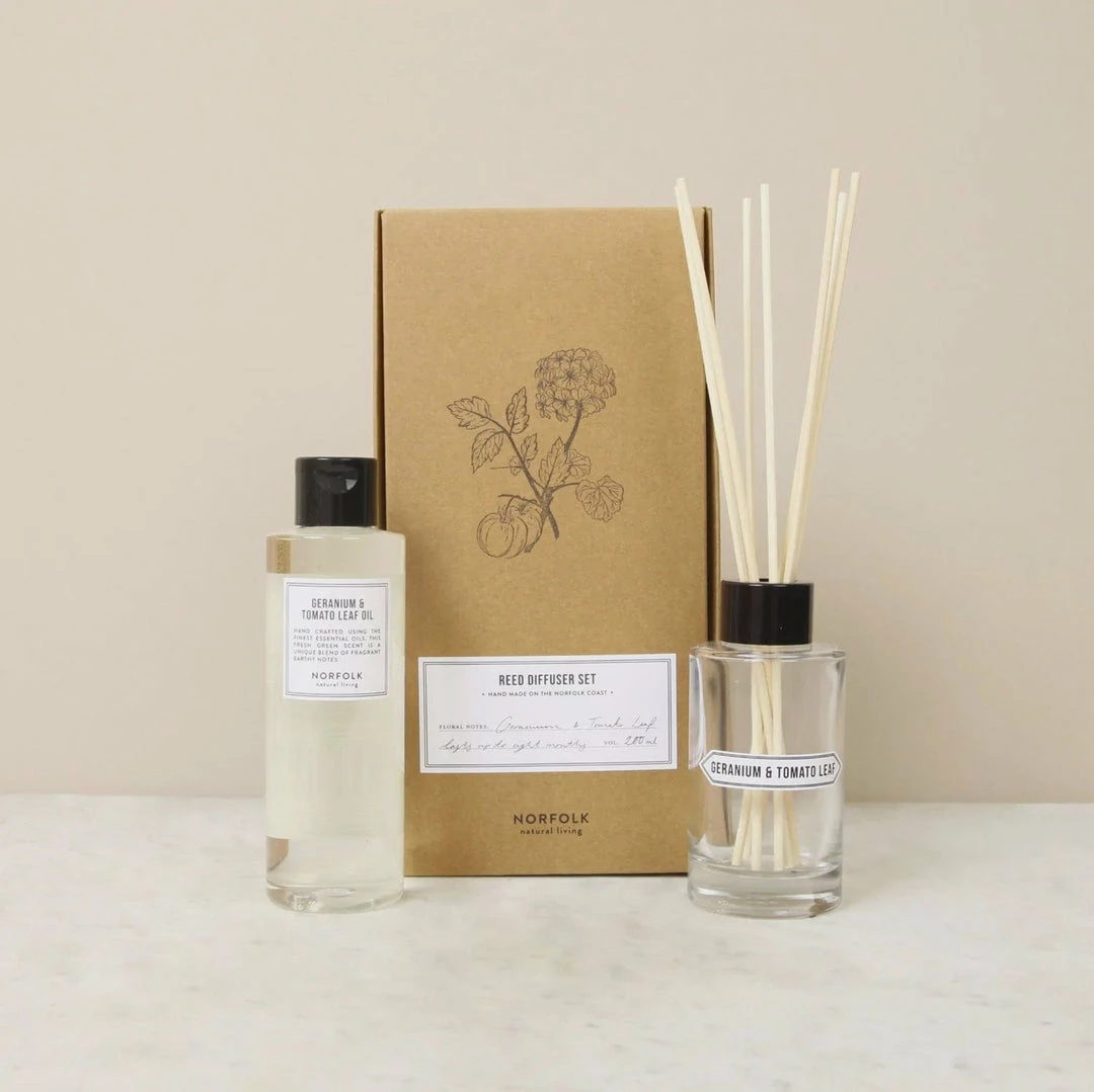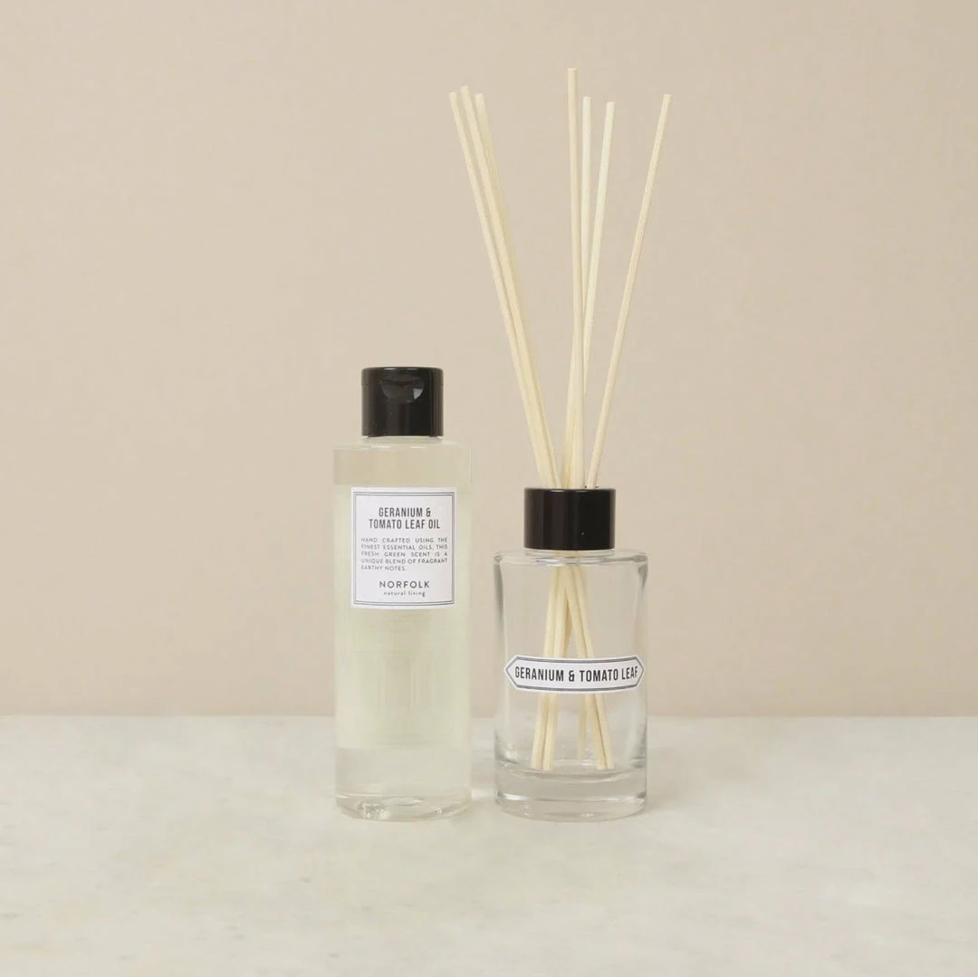 Fill your home with the refreshing scent of Geranium & Tomato Leafi. Our natural reed diffuser oil set is as elegant to see as it is pleasant to smell.