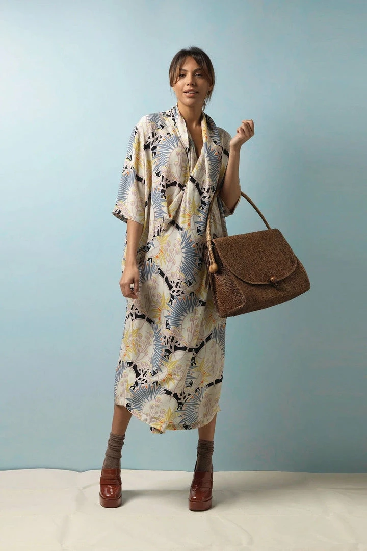 This wonderful vintage inspired print has a timeless feel to it, featuring art deco style flowers in delicate pastels colours on an easy to wear black background.