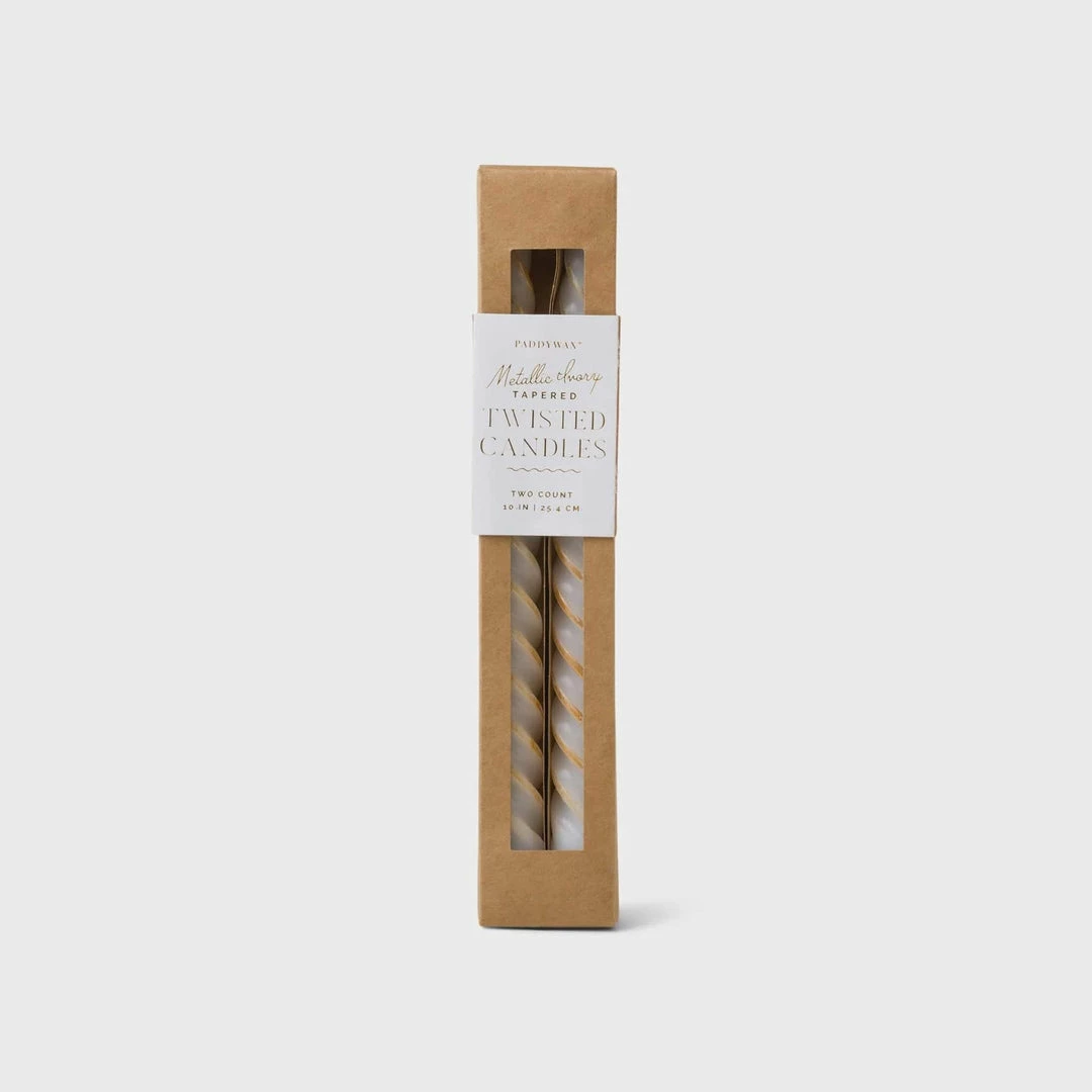 Set of 2 twisted candle tapers in a box. Cypress & Fir scent for the season.