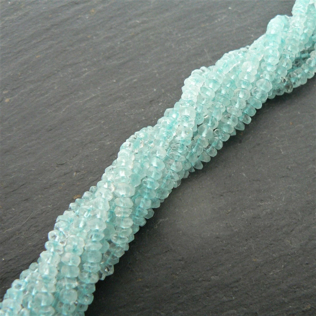Beautiful small faceted rondelles in a icy blue natural Aquamarine, 15″ strand. Slightly smaller beads- in a 3-3.5mm size. Perfect for high quality designs.