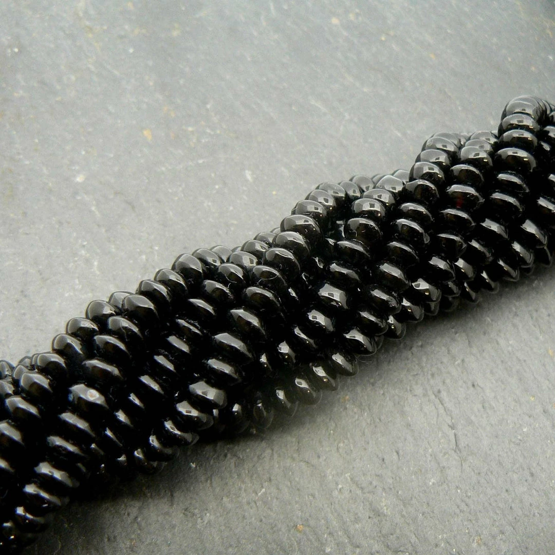 Black Onyx Button Beads on a 15″ Strand. These button (unfaceted rondelle shape) beads measure approximately 5mm wide and make the ideal spacer bead.