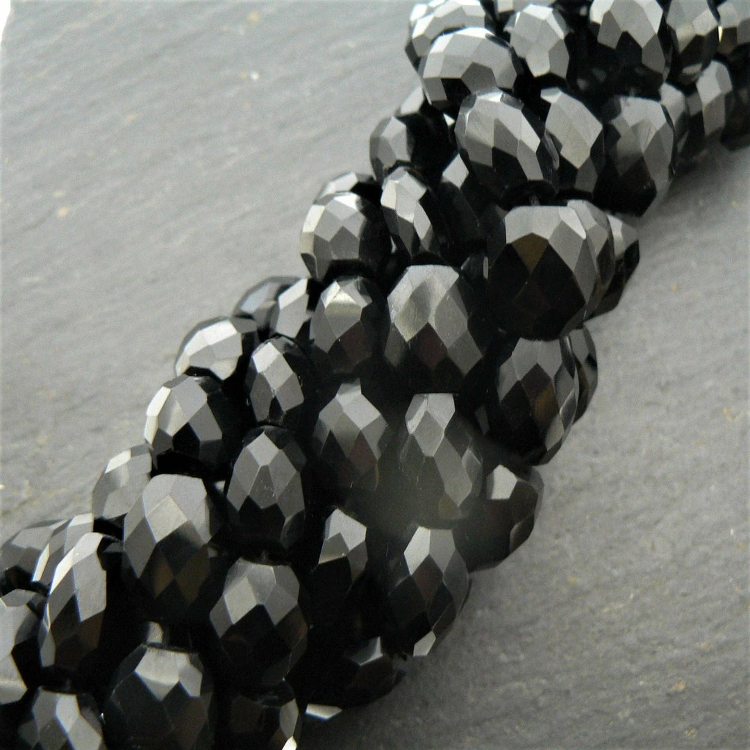 Beautiful glossy Black Onyx faceted oval beads on a 15″ strand measuring approx 6x9mm in size (some slightly more or less). Just stunning beads with great sparkle and shine.