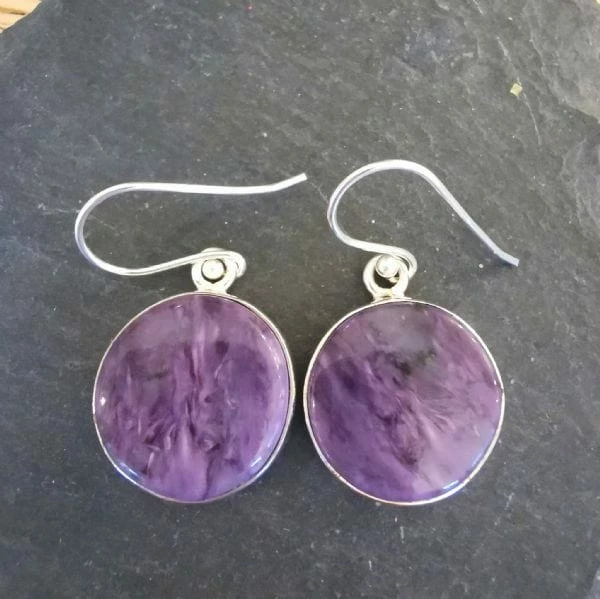 Gorgeous natural purple Charoite round stones set in Sterling Silver and measuring 16mm round each, excluding the earwire. They are just a glorious example of the stone. Stamped .925.ย