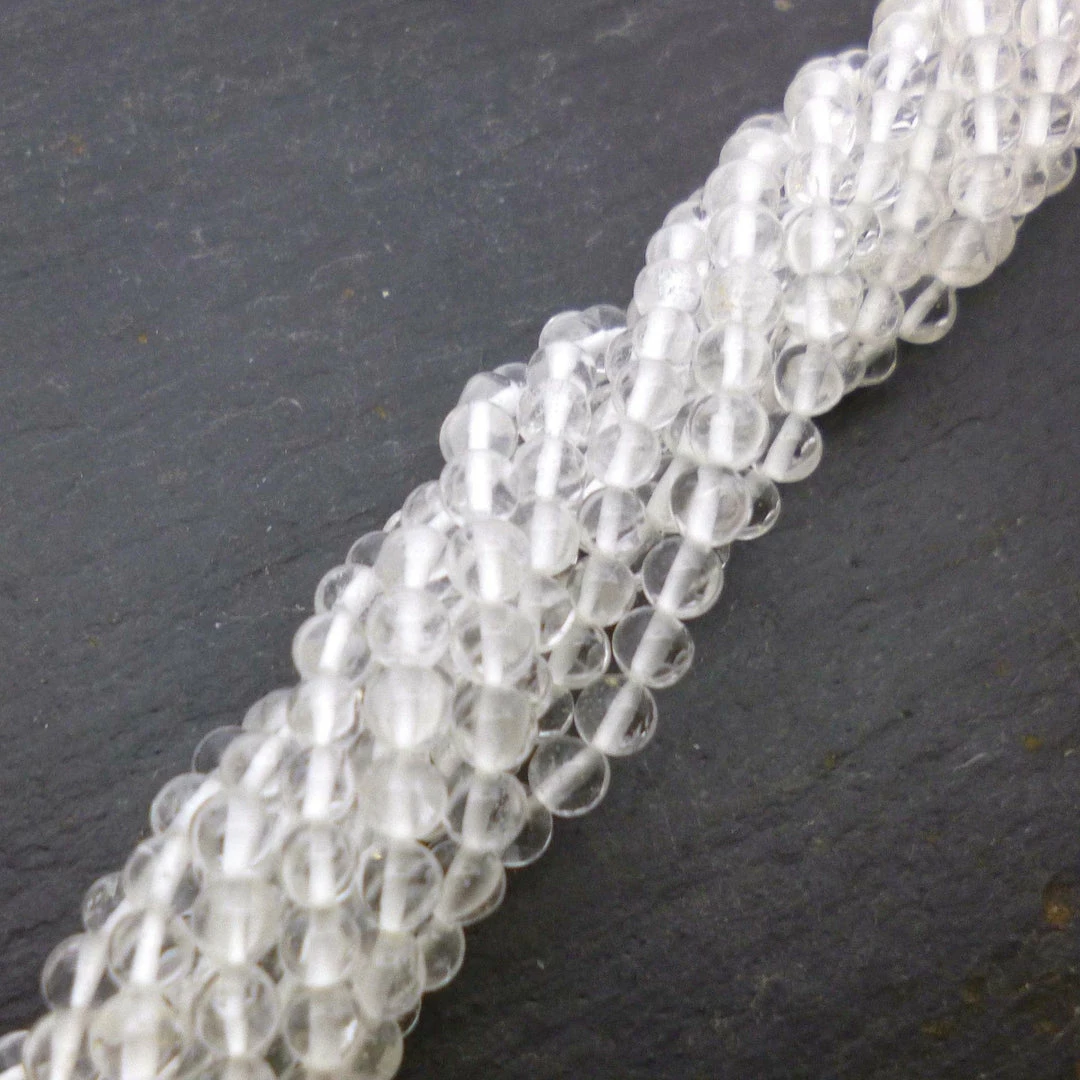 A 15″ Strand of Crystal Quartz 4mm round beads with around 94 beads per strand. An excellent staple that goes with everything.