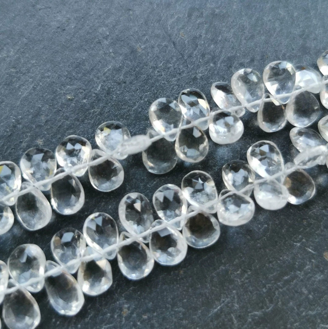 Exquisite- beautiful quality faceted crystal quartz pear shaped briolettes. Sold in sets of 5 beads, the beads measure 10x7mm approximately.