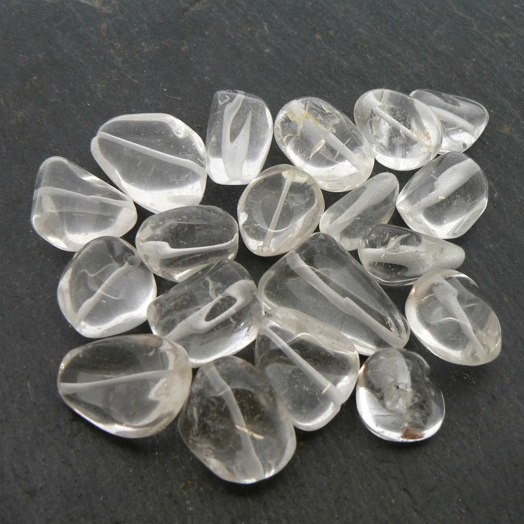 Crystal quartz plain (unfaceted) nuggets with some inclusions (internal lines) but very good clarity, measuring from 15×13 to 22x15mm approx. Sold per bead.
