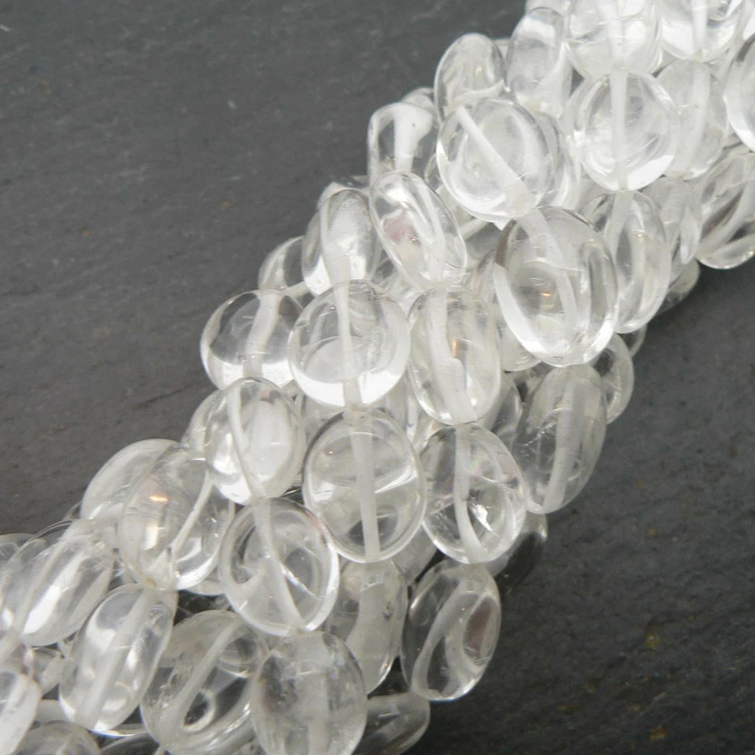 These are crystal quartz plain (unfaceted) oval beads measuring in the region ofย 10-12x7mm in size, with some variation.These are fairly big ovals with 32 beads to a strand on average.