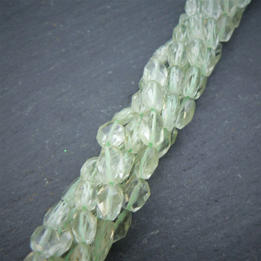Absolutely stunning Green Amethyst faceted ovals on a 15″ strand. Very good quality, excellent colour, only very few inclusions. Around 43 beads per strand each bead measuring smaller than previous batches at around around 6x8mm or thereabouts.