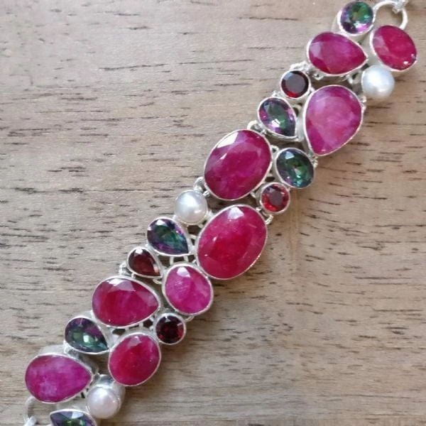 This exceptional piece is made up of 22 semi precious stones including cut stonesΒ in Ruby, Garnet, Mystic Topaz and freshwater pearl cabochons. Because of the extender this bracelet can be adjusted from 7 inches to 9 inches.Β Set in a substantial sterling silver setting.Β