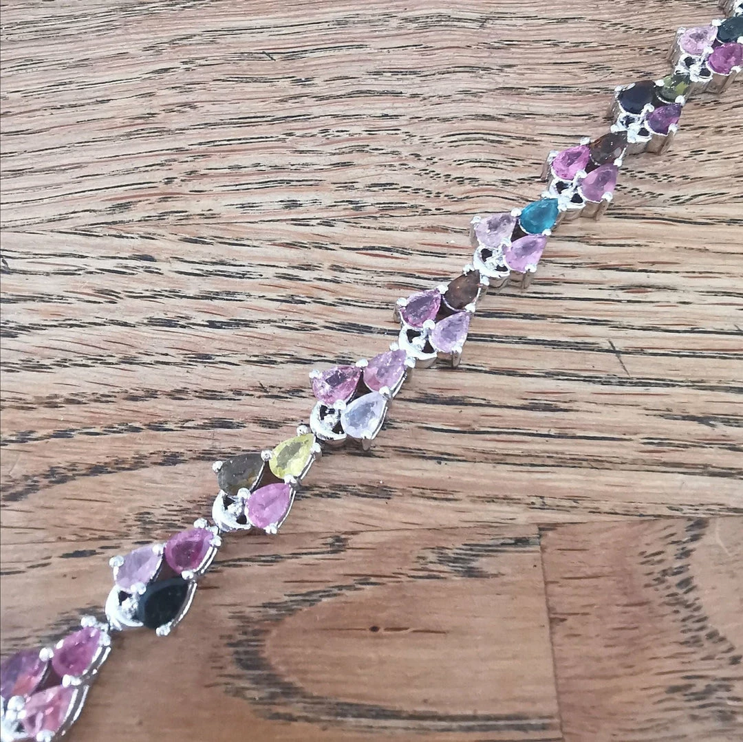 This exceptional piece is made up of 33 semi precious cut stones inย Multiย Tourmaline. Set in a substantial sterling silver setting. We think this is one of the prettiest pieces we have had and cannot imagine this ever being out of fashion. A real keeper!