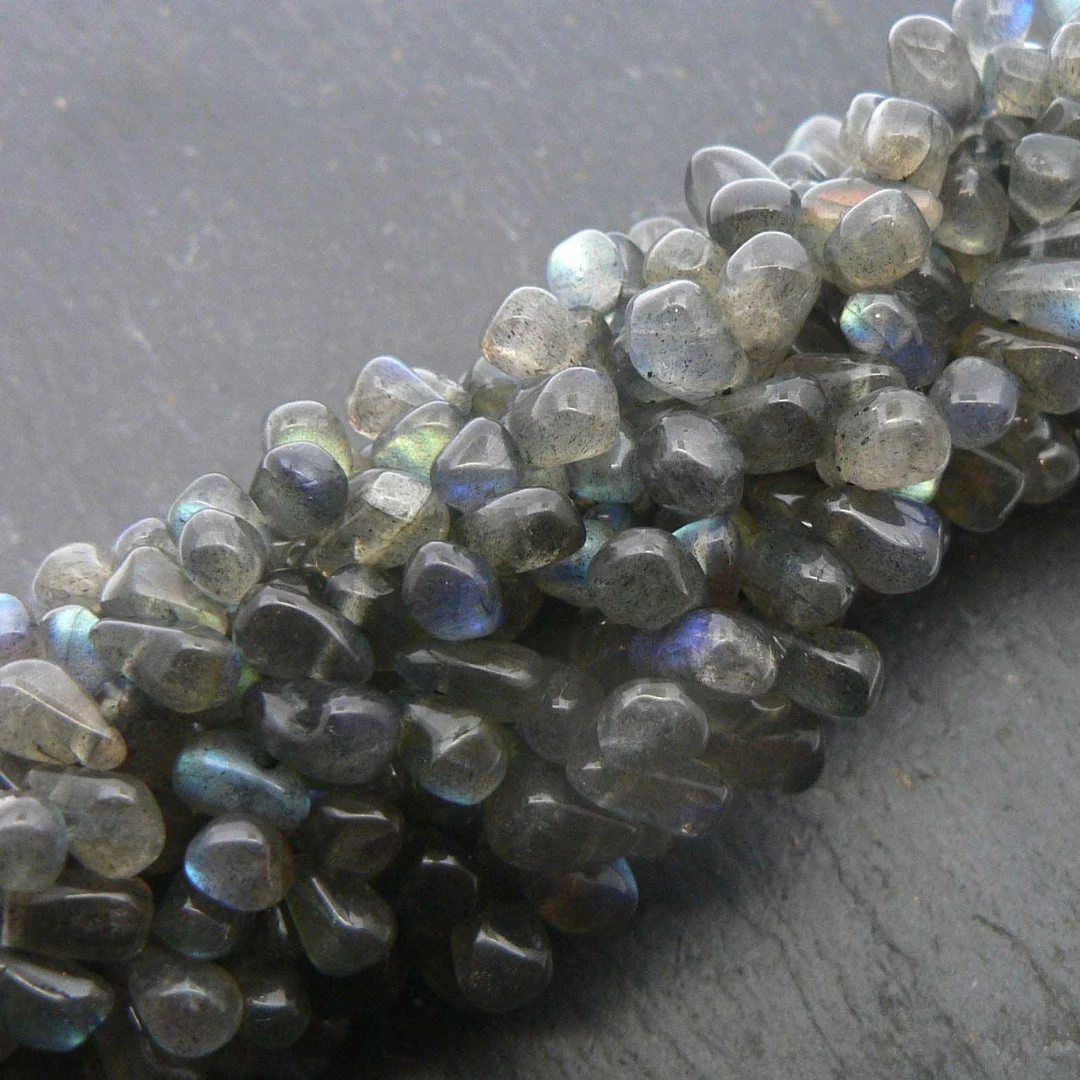 Popular plain drop briolettes, around 6x4mm in size- a strand full of ’em! Beautiful flashings. Very versatile!