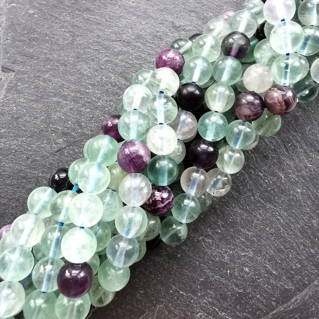 Fluorite (also called fluorspar) is the mineral form of calcium fluoride and occurs in all colours of the spectrum. As beads it comes with natural multicolours on the strand including yellow, green, blue and purple.