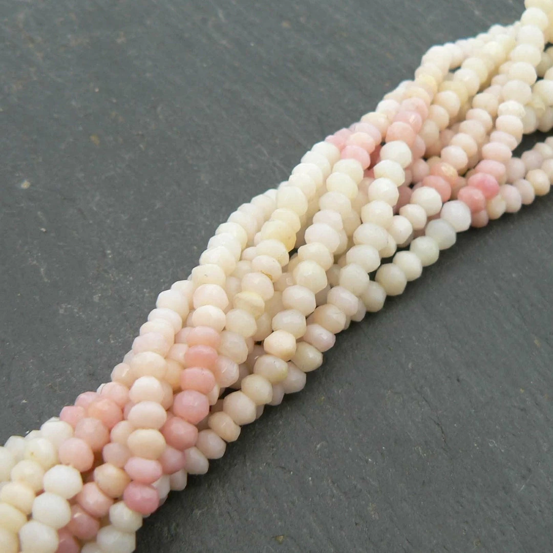 Gorgeous, natural Pink Peruvian Opal faceted rondelles that have been beautifully cut by hand. Beads measure 4-5mm in size. Really special, unique and stunning beads. These beads are shaded in colour and the effect is stunning! If only the photograph showed the incredible shine of these beads- it is truly fabulous.